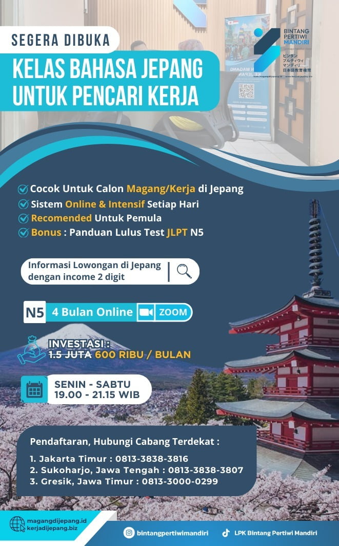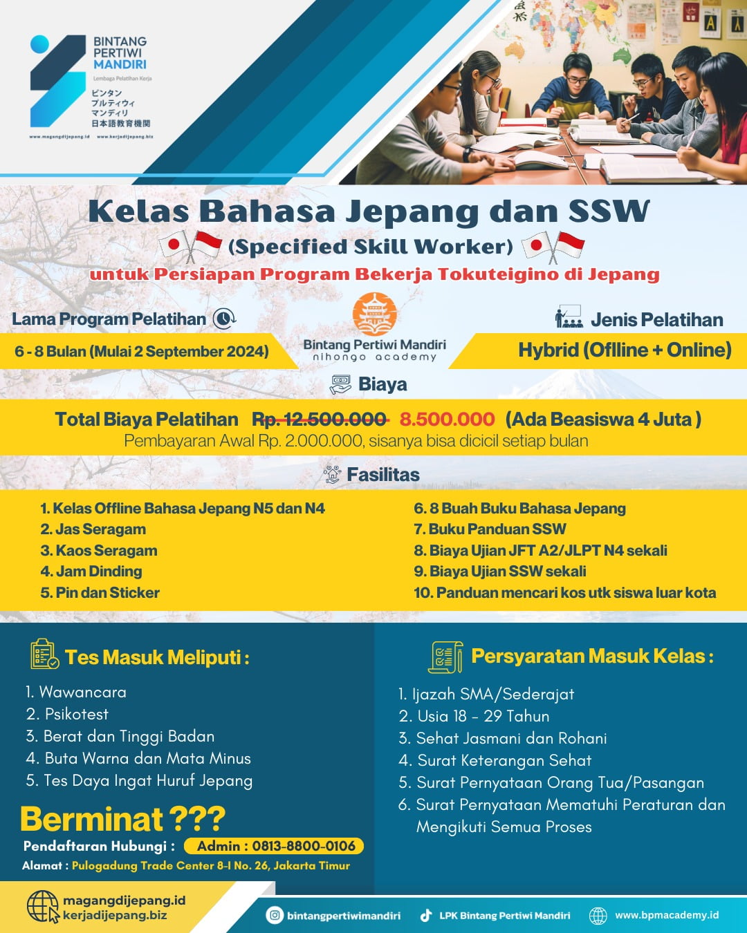 Nasional, Kerjawoow.com – Kegiatan Jobfair yang diselenggarakan oleh LPK Bintang Pertiwi Mandiri di SMK Adi Luhur Jakarta merupakan sebuah inisiatif yang bertujuan untuk mempersiapkan siswa-siswi dalam menghadapi peluang kerja di Jepang. Acara ini berlangsung pada hari Selasa, 8 Januari 2025, dan dihadiri oleh tim profesional dari LPK Bintang Pertiwi Mandiri,…